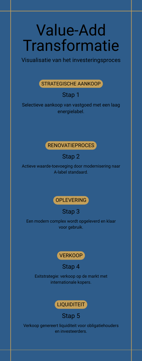 Liquiditeit: Na de succesvolle verkoop wordt het kapitaal inclusief de geprojecteerde winst van 25% gealloceerd aan de investeerders.